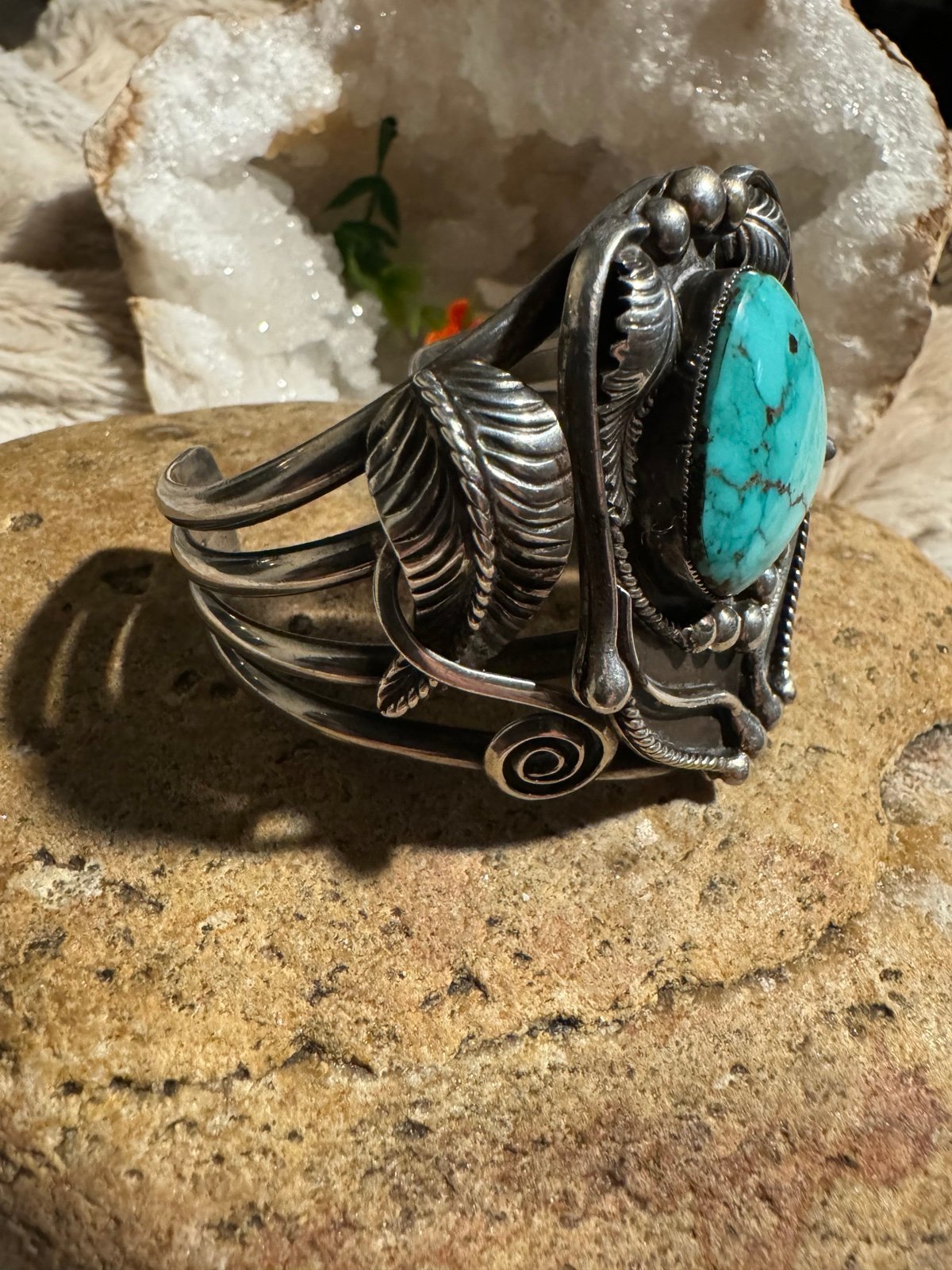 This is a tremendous vintage Navajo large single stone sterling silver bracelet. This impeccable bracelet contains a phenomenal large center Red Mountain turquoise stone. Surrounding the stone are wonderful silver works that consist of ropes, raindrops, swirling stems, leaves and wave works. This bracelet contains a marvelous heavy and quadruple thick silver shank cuff. The height at the center of the bracelet measures around 2" while the width at the center of the cuff measures around 2-1/2". The center stone measures around 1" x 1" Signed by Navajo artist, Walter Mitchell. Sterling silver. Cir. 1970's+. The inside end-to-end measures around 5-1/4" with an additional 1-1/2" gap. Sturdy 78 grams.