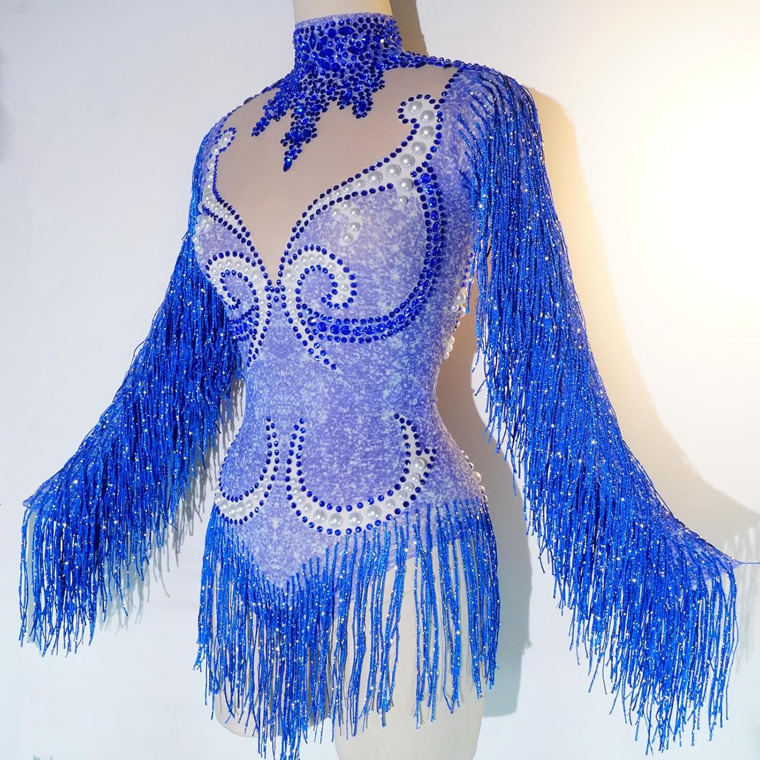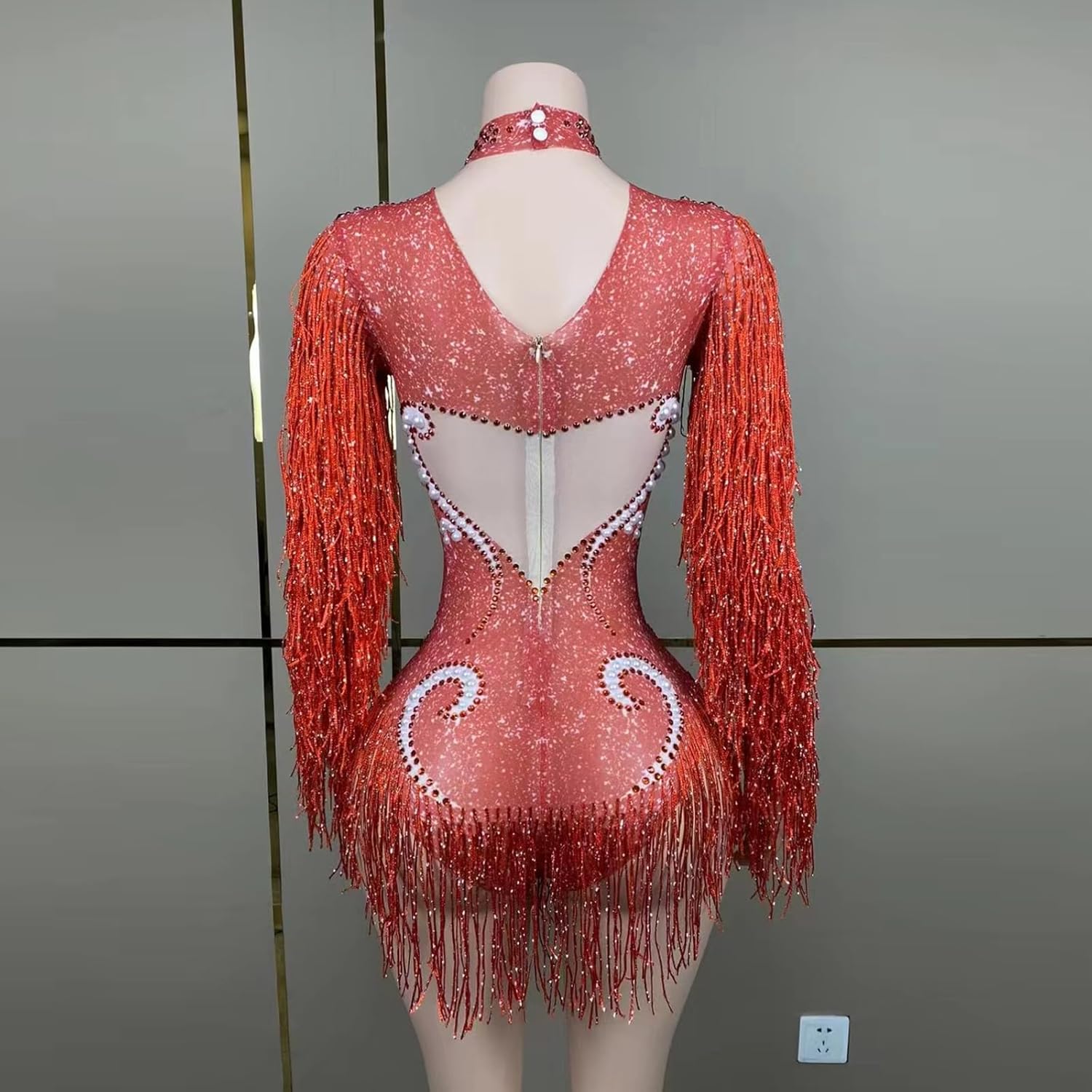 Dazzle and shine on the dance floor with this fashion-forward fringe bodysuit. The long sleeves and body-hugging fit ensure a flattering silhouette, while the fringed details add a playful, flirty touch. Perfect for dance performances, stage shows, or any occasion where you want to make a bold statement, this bodysuit is sure to turn heads. Pair it with your favorite heels and let your moves do the talking. With its high-quality construction and vibrant red hue, this bodysuit is a must-have for any fashionista's wardrobe. Embrace your inner diva and own the spotlight!