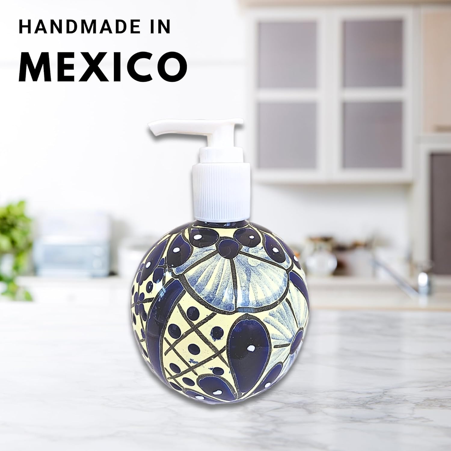 Introducing the Mexican Ceramic Spherical Soap and Lotion Dispenser - a stylish and functional addition to your kitchen or bathroom. This blue and white Talavera soap dispenser is handcrafted and hand-painted individually by Mexico's finest artisans, making each one unique and adding a touch of authenticity to your space. Measuring 5.5 inches tall and 4 inches wide, this soap dispenser is the perfect size for any kitchen or bathroom countertop. The blue and white color palette is inspired by traditional Mexican Talavera pottery, and will add a pop of color to any space. This soap dispenser is more than just a regular soap dispenser. It is fade resistant and can be safely used in the microwave and dishwasher. It is also ethically sourced, as we source it directly from local artisans who use traditional techniques to make these pieces. This is our way of supporting communities around Mexico and preserving their traditions. Add this unique and beautiful Mexican Ceramic Spherical Soap and Lotion Dispenser to your kitchen or bathroom today and enjoy the authentic style and functionality it brings. It is a great piece for any space. Why You Should Buy: A Pop of Color & Authenticity: The blue and white Talavera-inspired design adds vibrant cultural flair to any space, making it a standout décor piece. Handmade with Care: Unlike mass-produced dispensers, this piece is crafted with attention to detail, ensuring that no two are exactly alike. Support Artisans: Purchasing this dispenser directly contributes to the livelihoods of artisans in Mexico, preserving traditional techniques and supporting families. Versatile & Functional: Whether for soap, lotion, or even hand sanitizer, this dispenser is as practical as it is beautiful. Lifestyle Integration: Brighten your daily routine with this one-of-a-kind soap dispenser. Its stunning design and functional use make it a perfect addition to both modern and traditional home décor. Whether you're updating your bathroom or kitchen, this dispenser brings both charm and utility to your countertops, while celebrating the artistry of Talavera pottery.
