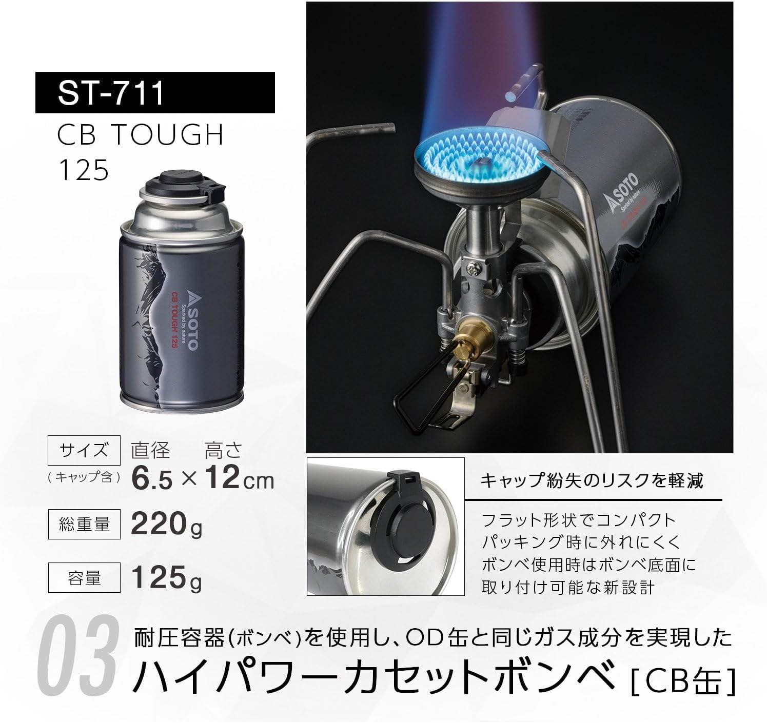 [Regulator Stove TriTrail ST-350] This model is equipped with SOTO unique "Micro Regulator". This is a CB can model, but is a lightweight single stove for mountain climbing. Compact and lightweight with excellent portability and packing. When used in conjunction with the CB TOUGH cylinder (ST-711, ST-712), it maintains a stable fire power even in high altitude and low temperatures. [CB TOUGH 125 ST-711] High power cassette cylinder that can be used in cold climates. By switching to a container (cylinder) that is more pressure resistant than conventional CB cans, it safely realizes a gas formulation of the same class as OD cans. The gas ingredients are a mix of 3 types of propane, isobutane, and normal butane with the same pressure as SOTO OD cans, and it is less likely to be affected by outside temperature. The use of a pressure-resistant container (gas cylinder) allows you to safely carry it in the summer where the temperature is high. It is more affordable than an OD can, but can also be used in a environment similar to SOTO OD cans. The new shape of the gas cylinder cap can be attached to the bottom of the CB TOUGH, preventing loss during use. Flat shape reduces height and compact. Stays hard to fall off when stored.