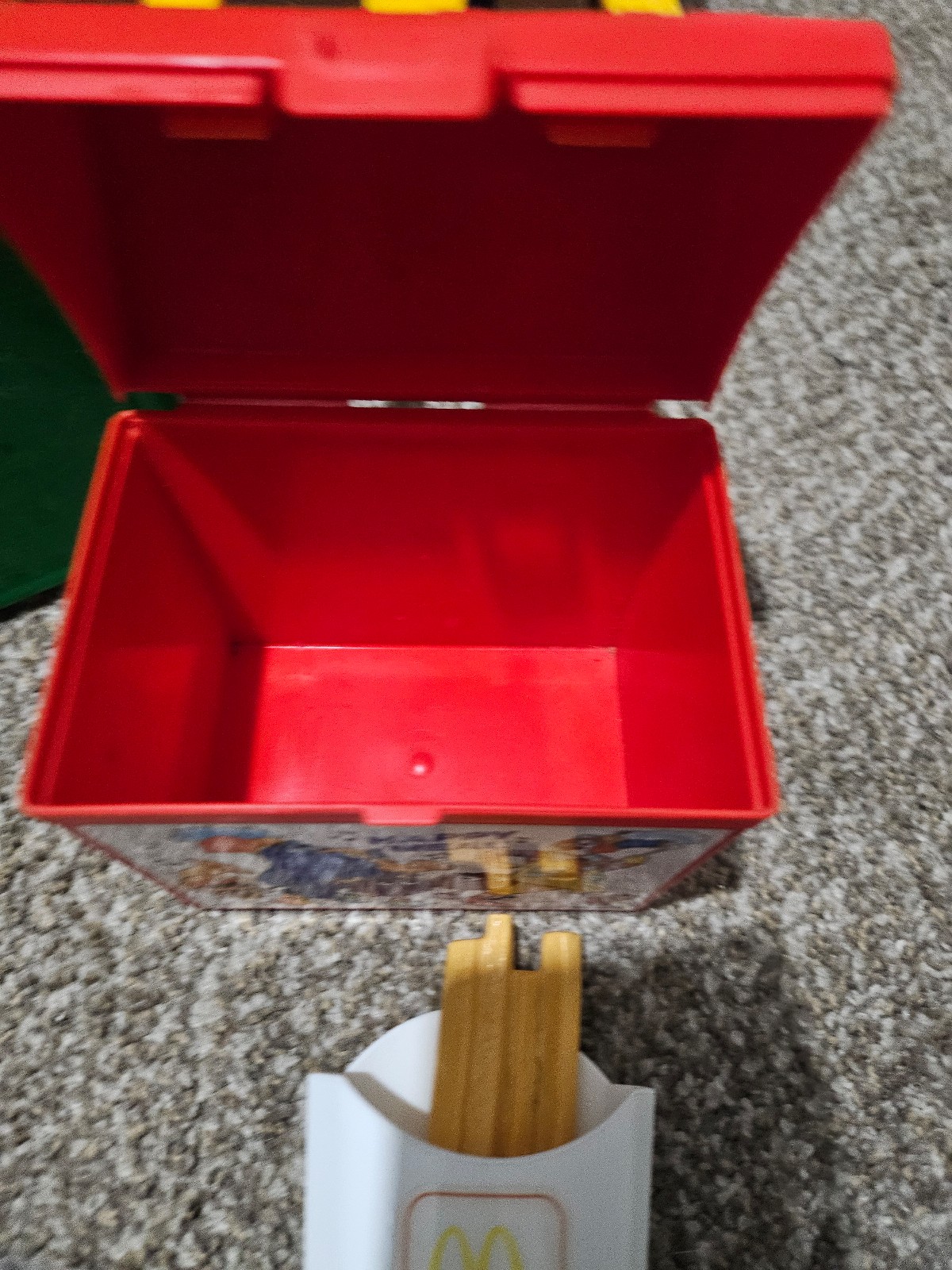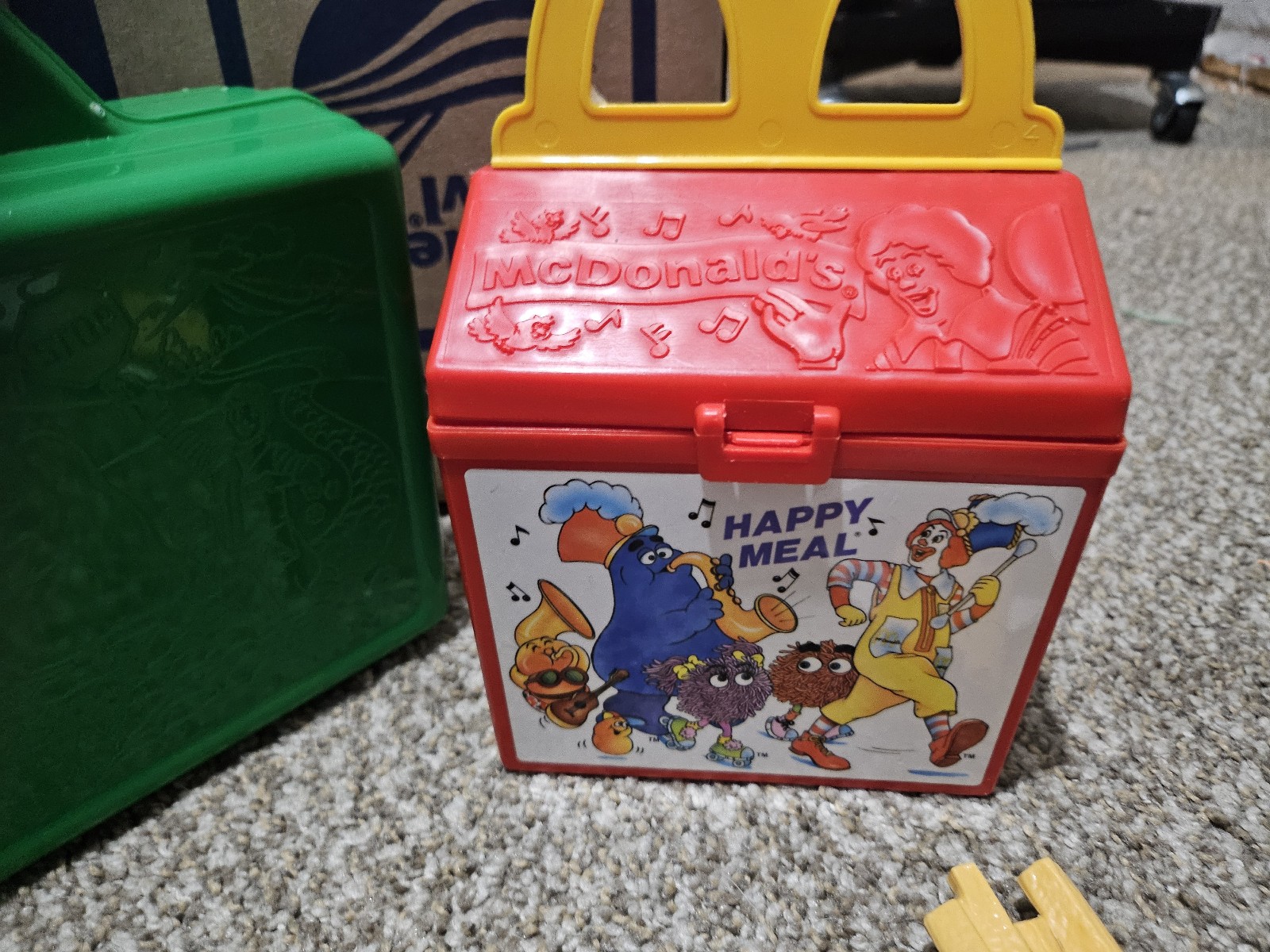 Good condition comes as shown. Toy has been played with and doesn't close down all the way has small gap comes with the other mcdonalds lunch boxes. Comes with everything you see smoke free home